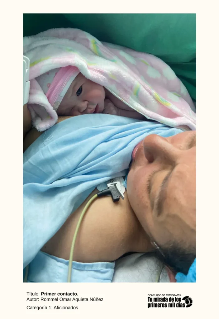 Esta fotografía transmite la emoción del primer contacto piel con piel entre Leila y su madre. A penas pocos minutos de nacida los médicos que la recibieron colocaron a la bebé en el pecho de su mamá. De manera inmediata Leila abrió los ojos tras escuchar el sonido de la voz que la saludaba y haciendo contacto directo con ella fijó su mirada en mamá y se tranquilizó consiguiendo un momento pleno de conexión entre madre e hija, donde el sonido de su voz y el contacto de su piel con la suya se funden en una sincronía perfecta de amor y ternura.